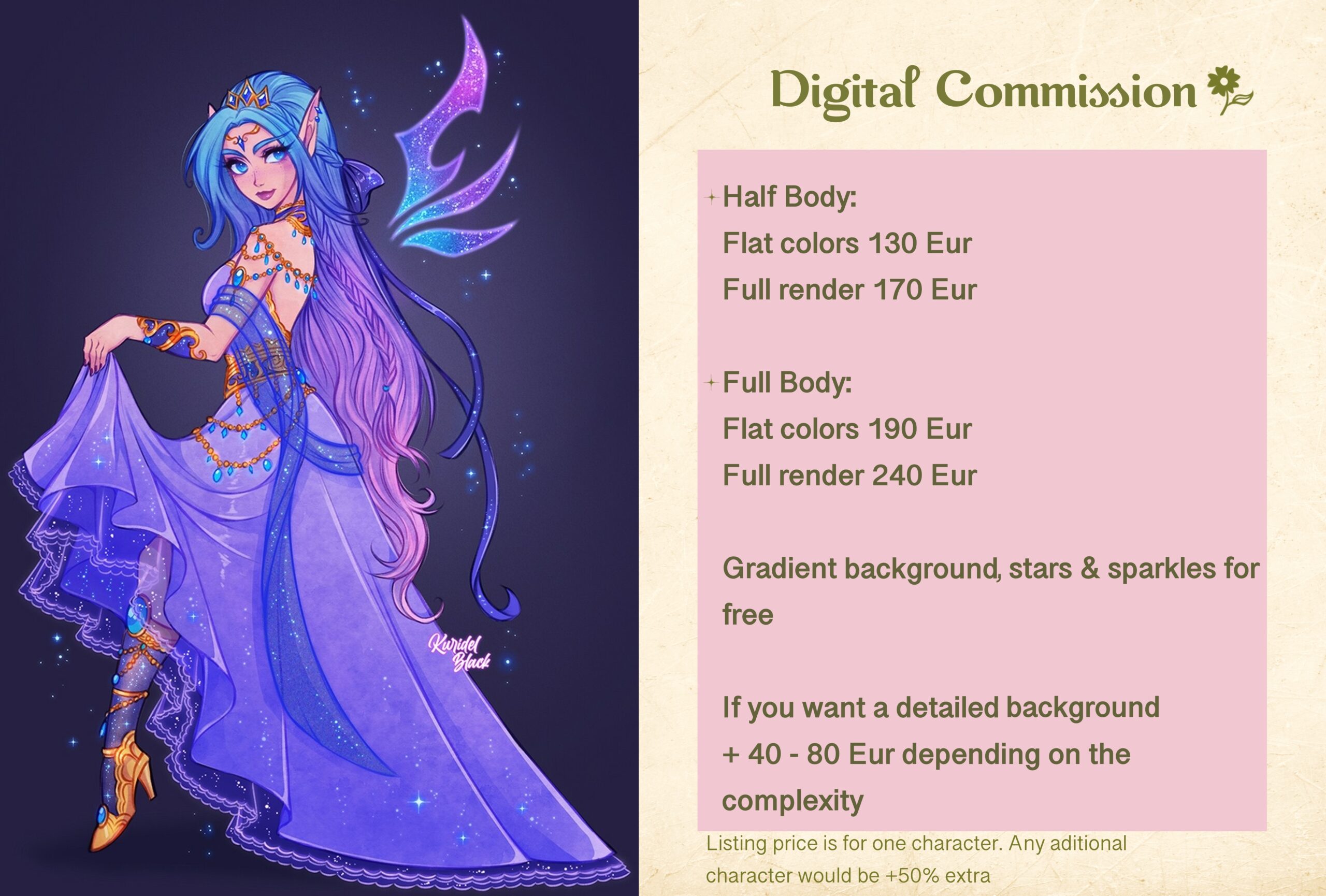• Additions/special requests not specifically listed might increase the price (Big Weapons, Wings, detailed outfit/armor, pets/companions, …)